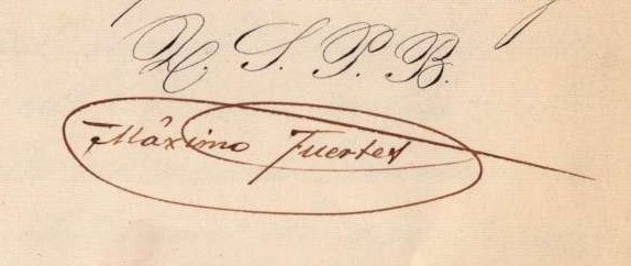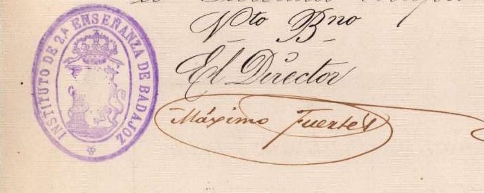 Firma del director Máximo Fuertes y sello del Instituto de 2º Enseñanza de Badajoz