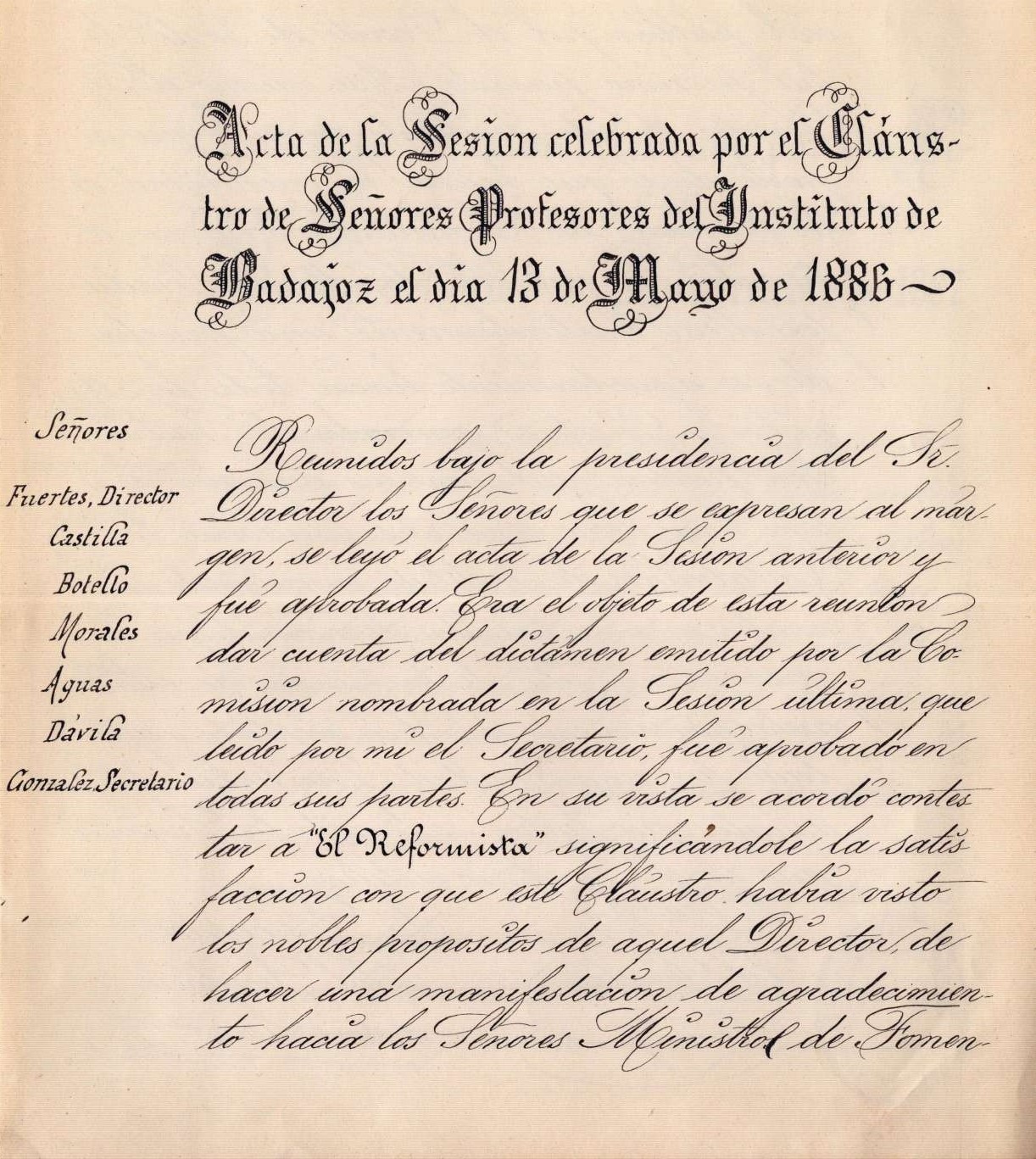 El Centro de la Documentación y de la Imagen de Extremadura (CDIEX) a través del fondo de Fundación CB da a conocer un documento de 1888 del Instituto de Segunda Enseñanza de Badajoz dirigido al Excmo. Sr. D. Pedro J. Pidal. Se trata de un manuscrito firmado por el entonces director, Máximo Fuertes, fechado el 14 de marzo de ese año. Tanto la firma del director como el sello del centro confieren al volumen carácter oficial y testimonial.
