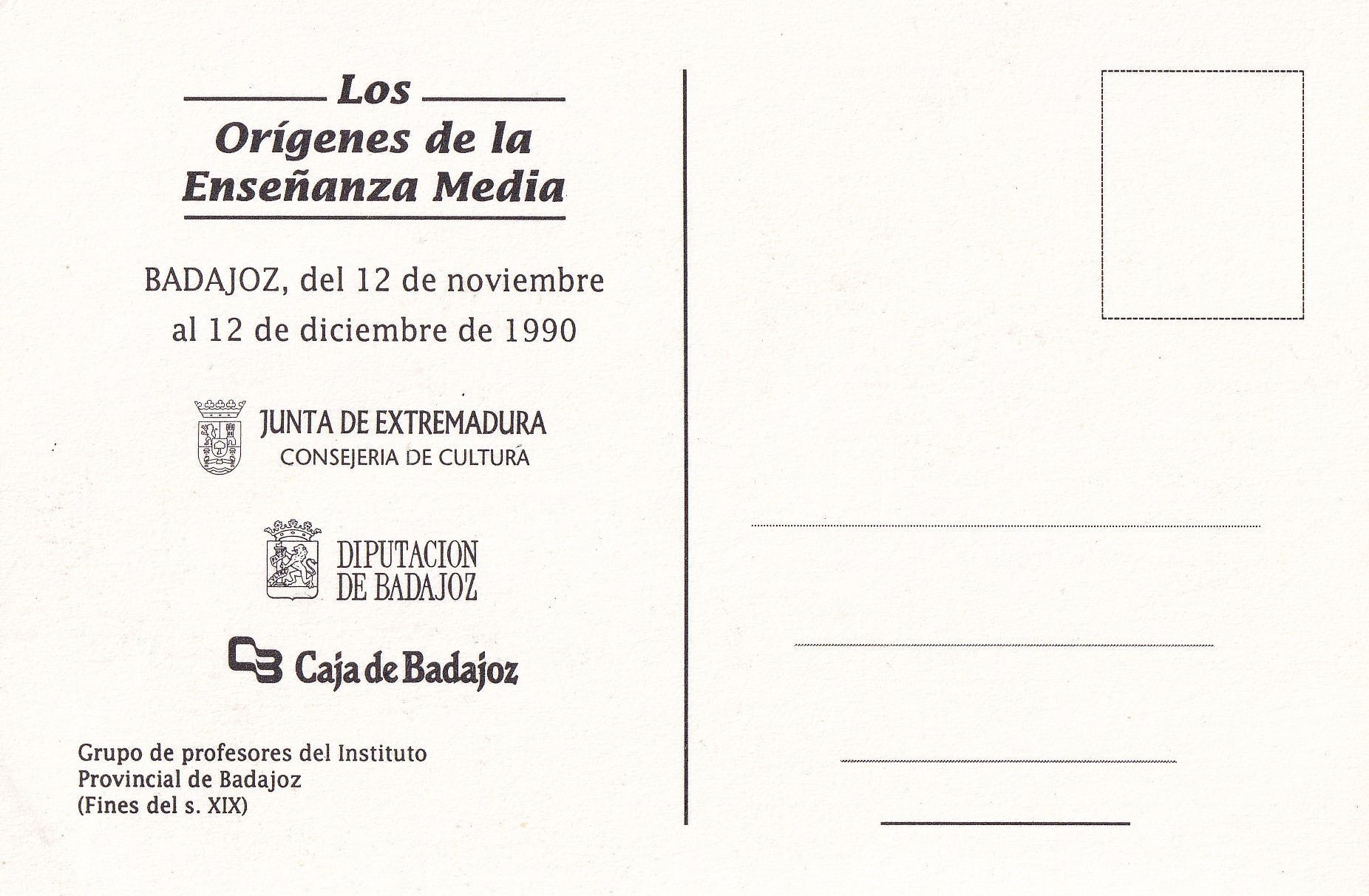 Esta postal formó parte de la exposición "Los orígenes de la enseñanza media", dedicada a la historia educativa de Badajoz en el siglo XIX y celebrada en la ciudad entre el 12 de noviembre y el 12 de diciembre de 1990. Consulte la ficha aquí.
