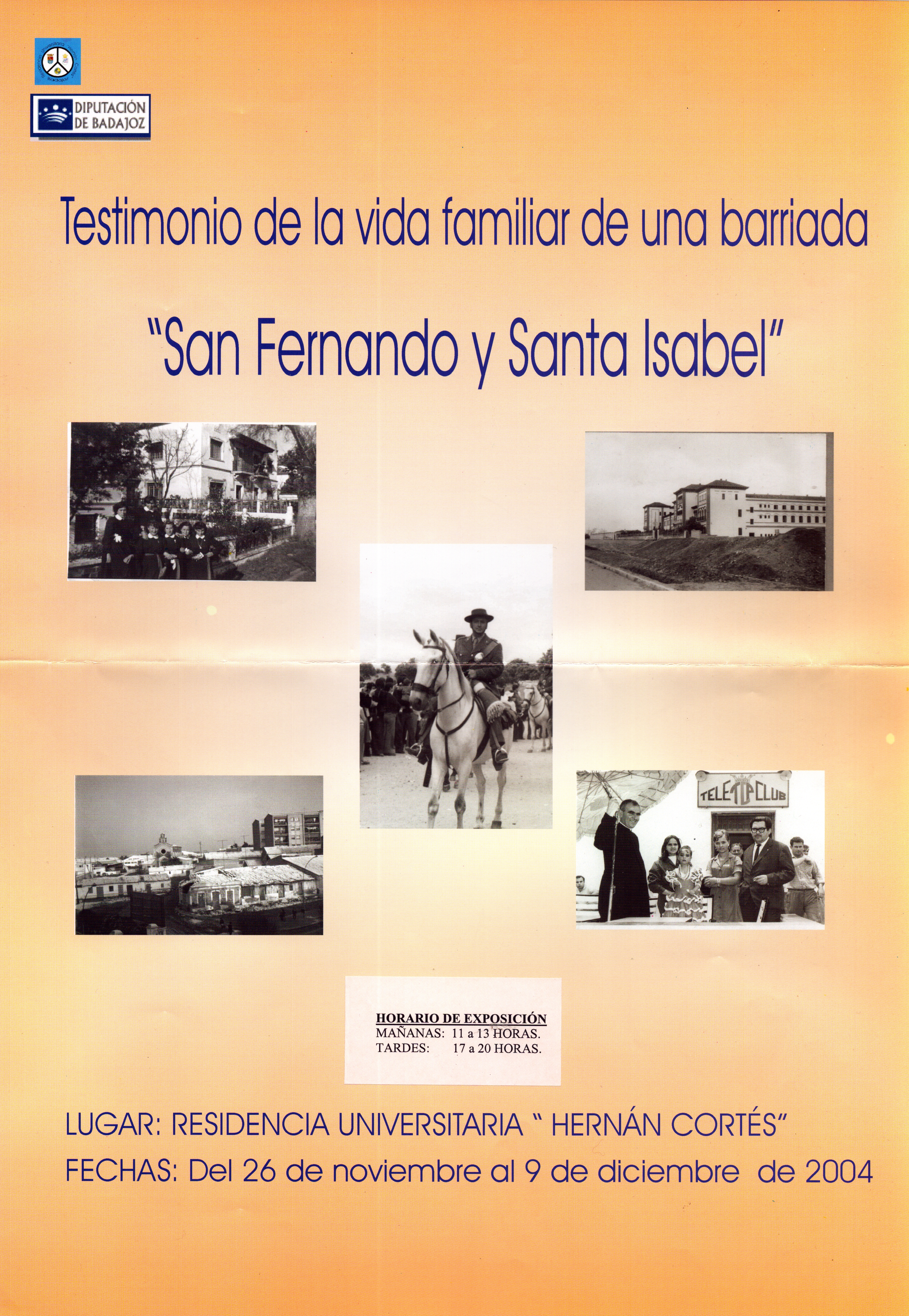Cartel de la exposición "Testimonio de la vida familiar de una barriada: San Fernando y Santa Isabel", celebrada en la Residencia Universitaria Hernán Cortés (Badajoz) en el año 2004.